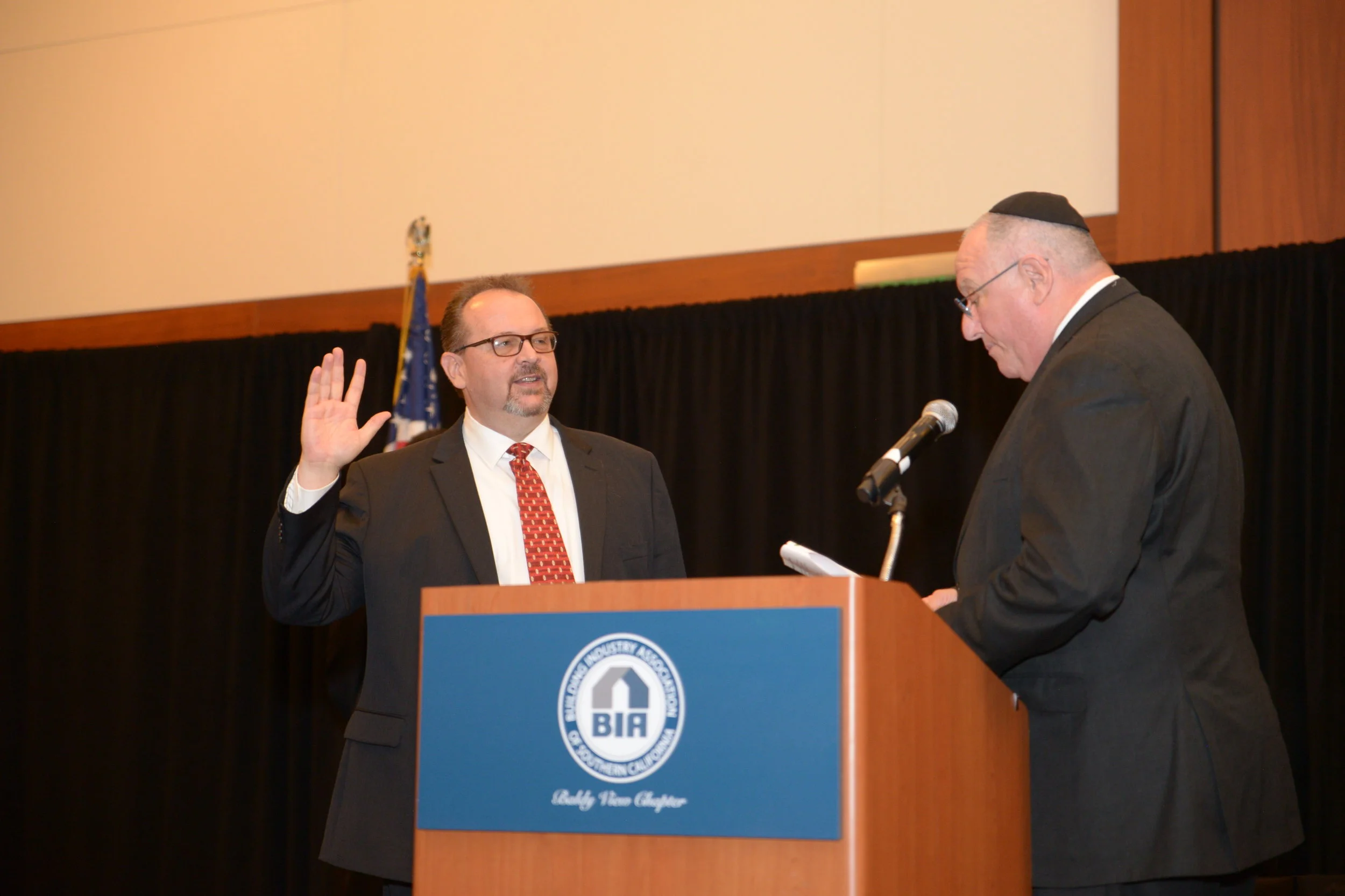 SCAG President and Ontario Mayor pro Tem Alan Wapner administers the oath of office to 2019 BIA Baldy View Chapter President Phil Burum, Diversified Pacific