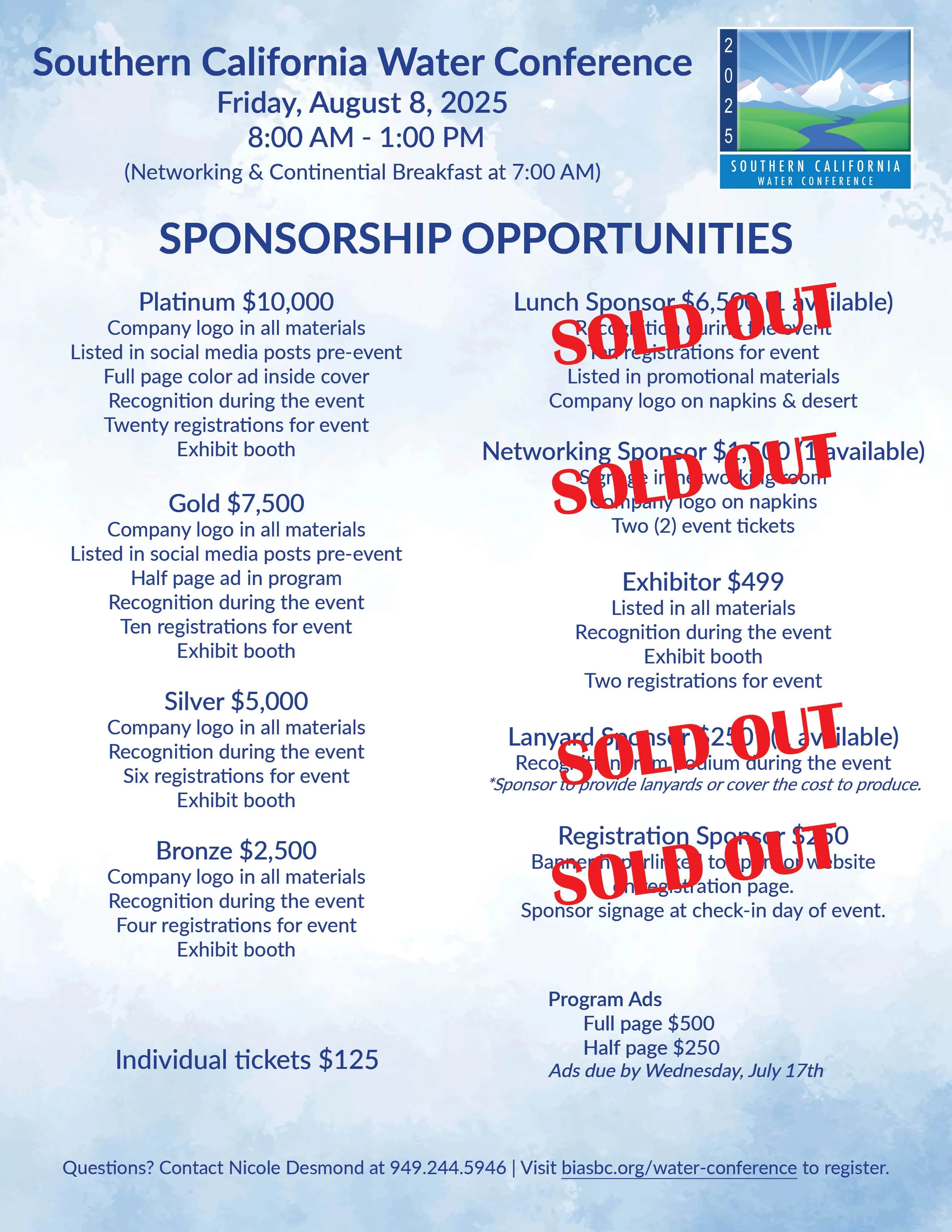 For nearly two decades, the BIA Southern California Water Conference has provided a forum where government officials, water management representatives, business leaders and community stakeholders come together to share best practices and discuss ideas to meet the challenges of serving the growing demand for water while protecting our natural resources.