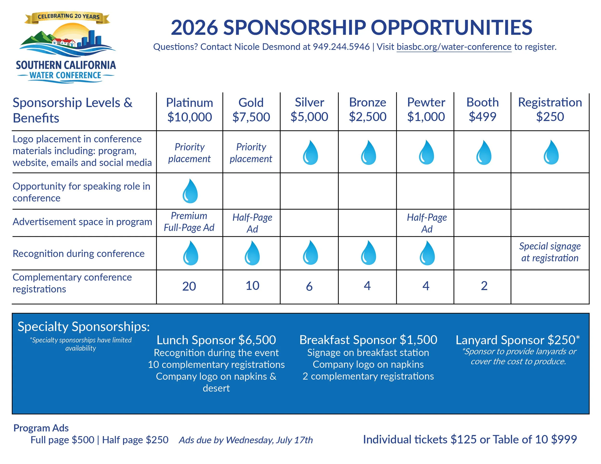 For two decades, the BIA Southern California Water Conference has provided a forum where government officials, water management representatives, business leaders and community stakeholders come together to share best practices and discuss ideas to meet the challenges of serving the growing demand for water while protecting our natural resources.